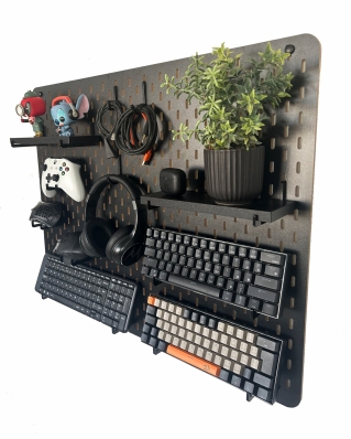 MEDIDAS: 76x59cm Material: - Face em MDF Ganchos em material Acrílico cortado a laser resistente e durável Acompanha kit de instalação - 4 buchas 6mm - 4 parafusos para bucha 6mm - 4 espaçadores para distanciar - 4 acabamentos para os parafusos kit de ganchos: - 4 ganchos 30mm para cabos - 2 ganchos 20mm quadrado - 12 ganchos 45mm serve para teclado, mouse, controle PS, Xbox, Headset e ou teclados. - 4 ganchos 80mm (para as prateleiras) - 2 prateleira 250x80mm Fabricação própria Os itens de decoração e equipamentos periféricos não acompanham o produto. |